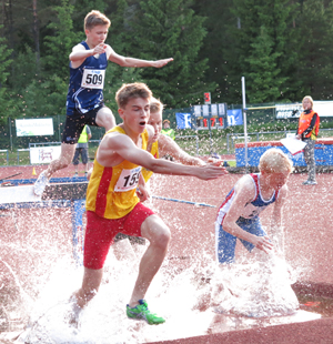 Andra tävlingsdagen av HUDDINGESPELEN bjöd på ett betydligt bättre väder och med det också många bra resultat. Fortfarande glest med juniorstarter från HAIS-håll eftersom de flesta har Lag-USM på söndag att tänka på. Vi gör ett axplock ur de många resultaten och börjar denna gång med Niclas Wallin som visar att han är på gång att bli en riktigt bra löpare då han persade ner till 2.13,45 på 800 meter. Bilden är från hans hinderlopp på fredagskvällen. Mera lovande medeldistans visade David Tellström Jovicic upp när han vann P11 600 meter på fina 1.47,72 och dessutom tog hem längd med 4.70 och kom tvåa i boll med 38.56. Även P12 600 meter togs hem av en HAIS:are i form av Johannes Lilius och Victor Sundh tog hem P10 boll. Bland de äldre löparna hade vi hoppats på att få se Tom Kling-Baptiste på hemmaplan men tyvärr tjuvade han ut sig på 100 meter. Alexander Nordkvist kom tvåa på 400 meter i kamp med Mattias Claesson på 49,37. På tjejsidan börjar Stefania Hakansdottir få fart på benen och gick återigen under 60 sekunder och noterade 59,18. Otto Kingstedt förmådde inte upprepa sitt superlopp på 1500 meter från Sayo men gick in på "nästperset" 4.10,57 som tvåa efter Ken Slättengren. Avdelningen kast bjöd på en riktigt fight i P17-klassen där Alexander Persson i sin fjärde kulstöt gick om ledande Gabriel Heen med en centimeter och noterade 14.72. I samma gren visade Arwid Koskinen på bättre och bättre säkerhet och hade denna gån fyra godkända stötar med den bästa på 16.28. Slutligen så känns det som att vi har ett framtidshopp i spjut där Ivar Moissander tog hem P13-klassen på 31.44 vilket visar att specialträningen i favoritgrenen betalar sig och vi hoppas på en fortsatt spjutsatsning.