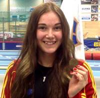 Det var en mycket glad Emilia Stenström efter att hon säkrat SM-bronset i mångkamps-SM. Den mycket träningsambitiöse Emilia tog medaljen i F17 efter den här serien: 60 hä/9,57 - höjd/1.64 - kula/12.23 - längd/5.12 - 600/1.51,04.