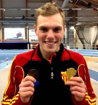 Andra dagen för killarna började med ett 60m häck lopp och alla 3 var sugna på att starta igång. Tyvärr kände Oskar av en knä skada han dragits med ett tag och tog det kloka beslutet att hoppa av mångkampen. För Fredrick gick det väldigt bra, då han sprang på 8.15, ett av de snabbaste han sprungit på distansen då han är ny på senior höjden på häckarna. För Anton gick det inte som han ville, 10.14 var inget han ville hänga i julgranen men det var bara att bita ihop och gå vidare. I staven sedan hoppade Anton 3.03 och han hade satt nytt säsongsbästa igen. Fredrick fick det inte riktigt att funka med han lyckades ändå ta 4.33 och tog några viktiga poäng inför ett viktigt 1000m lopp senare på dagen. Inför 1000m loppet såg det ut så här: Fredrick hade 7sek försprång på Rasmus Carlsson som jagade en 3plats i senior kampen. M22 klassen hade Fredrick en betryggande ledning och det skulle krävas mycket för att gå om honom där. Anton låg på 4 plats inför långloppet och för att ta en medalj behövde han springa 22 sekunder före 3:an Rasmus Elfgaard. Fredrick sprang och bevakade att Rasmus inte skulle ta de 7 sek han behövde. Väl i mål så visade det sig att Fredrick tagit ett brons i M klassen med 20p till godo på Rasmus Carlsson. Med en tid på ca 2:56.16 så var Fredrick ändå nöjd med sin allra första senior mångkamp inomhus och han åker hem med ett personligt rekord på 5404p och 2st medaljer, ett guld (M22) och ett brons (M). Anton som hade 22 sek att ta in gjorde en jätte insats och sprang in på nytt säsongs bästa 3:03.92. Men tyvärr hade han bara tagit in ca 19 sek av de 22 han behövde och det vart tyvärr inget brons för Anton Johansson. Han missade bronset med 30p men han persade totalt med en poäng på 3459p.