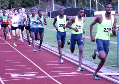 Per Synnerman och Jama Aiden hade verkligen fått ihop ett par lopp av yttersta världsklass i den sena fredagskvällen på ett fortfarande 27-gradigt Källbrink. 800-metersloppet blev mycket vasst där Musab Balla var anlitad som hare upp till 1.15 på 600. Lite för snabb öppning runt 22,6 gjorde att farten blev lite ojämn men Ayanleh Souleiman kunde ändå sololöpa de sista 250 meterna in till 1.43,69 endast 6/100 från perset och det gav en 8:e plats på världsstatistiken i år! Behöver knappast tilläggas att det gamla banrekordet rök all världens väg... Vår Huddingegäst Leo Manzano kom in som tvåa på 1.47,58 och Ahmad Bile från USA trea före Mattias Claesson och den grymma Warzame Hassan (98:a) som femma på 1.50,79!