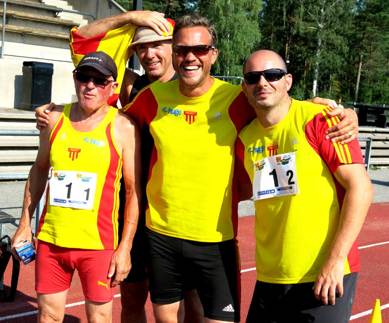 Den höga temperaturen fortsatte under lördagen också både i form av 30+grader och vassa tävlingar. Tidigt ut var 200-meterslöparna och Fotios Makrostergios hade en jättefight om guldet men fick vika ned sig med 2/100. Mycket medaljer på kastsidan ramlade in där Bengt Pettersson efter endast en godkänd stör kunde ro hem guldet i kula. Torbjörn Persson guld i kula och silver i slägga, och precis samma fördelning för Jöran Westberg samt Alpo Tornikoski guld i slägga några av kastarnas massiva medaljskörd. Coach Peter Gabrielsson tog hem en stabil seger i stavhoppet och på löpsidan hade vi två storlöpare som skördade var sitt guld på 1500 meter, vår egen Bill Krohn och världsmästaren Gunnar Durén från Hässelby. Avslutningsvis satte vårt 4x400 stafettlag ett nytt prydligt klubbrekord med 4.18,93.