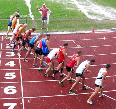 Bilden får symbolisera extremvädret som besökte Källbrink under en timma mitt i det 30-gradiga solskenet. Många skratt hördes när startern tryckte av pistolen samtidigt som åskan slog ner i belysningstornet och lurade iväg löparna! En fantastiskt duktig arrangörsgrupp fixade ändå tekniken med reservsysten och elaggregat så att eltiden kunde hållas rullande! Tävlingsmässigt mycket intressanta starter även sista VSM-dagen där "Fotte" visade på oanade talanger när han vann tresteg! I samma klass ställde en otränad sportchef Wirstedt upp men resultat en dragen baksida... Det var väl inte riktigt flyt i HAIS:arnas starter då även Johan Wibäck bröt 400 och Peter Engström bröt kokrthäcken. Men det fanns naturligtvis även glädjeämnen, både väntade och mera oväntade namn. Mats Nagle får väl räknas till första kategorin och fick vara med om det speciella att dela höjdguldet med två andra då man inte kunde sära resultaten! Bill Krohn gjorde en fantastisk 400-ing på 61,01 för första gången i sin karriär med startblock och Nils Olsson vann även hann 400 meter. Avdelningen mera ovana segrare var t.ex. Anna-Karin Wikström som tog hem släggan och har nu påbörjat sin andra aktiva sejour i HAIS, nu som coach!