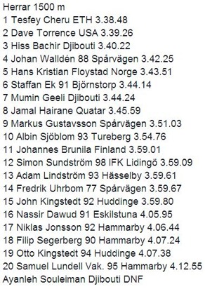 1500-loppet bjöd på Diamond League-status när det gäller dragjobb där tre harar, Souleiman, Balla och Bile skulle dra ner under 3.40 vilket lyckades för både segraren Tesfey Cheru från Etiopien, 3.38,48 och Dave Torrence från USA, 3.39,26. Bachir med sina 3.40,22 och därefter EM-jagande Johan Walldén som med sina 3.42,25 missade EM-kvaltiden med 1,75 sekunder. Längre ner i fältet sprang bröderna Kingstedt bra och visar på uppåtgående form införstundande SM. John in under 4 minuter med 2/10 tillgodo och Otto 4.07,38. Här sprang också Simon Sundström -98 för första gången under dröm-4.
