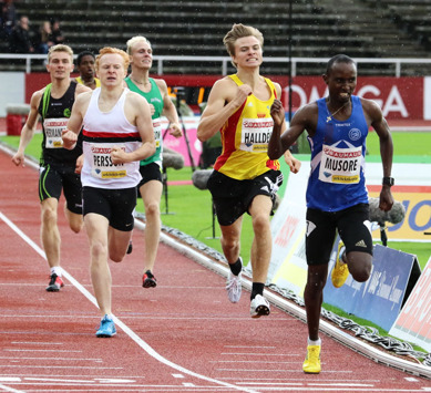 Efter en regnblöt eftermiddag lugnade det ner sig med vattnet men när killarna skulle springa 800 meter på BAUHAUSGALAN började det smådugga igen. Albin Johansson höll de 54,5 som var utlovat i pace första varvet och Christopher Halldén och Iyuel Ayele fick den start på loppet de ville ha. Efter ett starkt sistavarv kunde Christopher komma in som tvås på nya perset 1.55,20 efter segrande Bienvenue Musore. Bakom plockade Iyuel någon placering och kom in på 1.58,20.